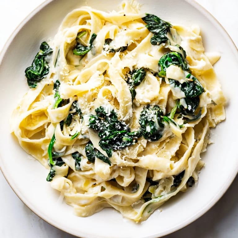 Pin It My neighbor knocked on my door one Wednesday evening holding a bag of spinach that was about to turn. She didn't want it to go to waste, and I had just boiled noodles for a quick dinner. What started as a pantry scramble turned into one of those meals you can't stop thinking about. The garlic hit the butter, the cream pooled around the noodles, and suddenly my tiny kitchen smelled like a restaurant I couldn't afford. I've made it at least a dozen times since, always thinking of her and that random act of vegetable rescue.