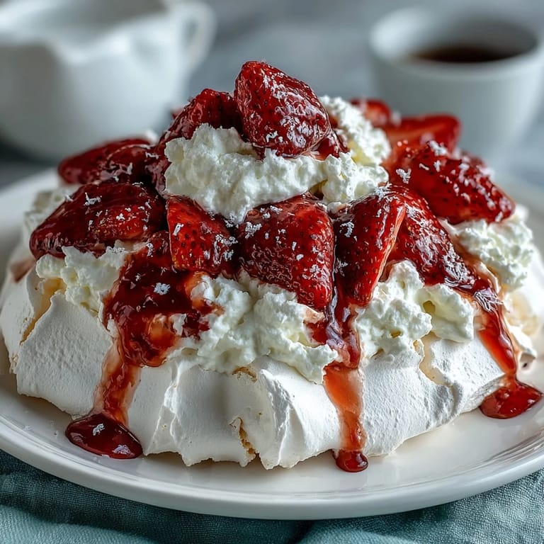 Pin It This Strawberry Pavlova with Whipped Cream is more than just a dessert—it's an experience. With its dramatic presentation, delightful textural contrasts, and harmonious blend of sweet and tart flavors, it embodies the art of simple yet sophisticated baking. Whether you're a seasoned baker looking to perfect your meringue technique or an adventurous home cook ready to impress, this pavlova delivers spectacular results. The recipe requires an electric mixer, mixing bowls, a spatula, baking sheet, and parchment paper. At just 185 calories per serving with 7g of fat, 30g of carbohydrates, and 2g of protein, it's a relatively light indulgence. Remember to note allergen information: this dessert contains eggs and dairy (milk), though it is naturally gluten-free. Gather your ingredients, take your time with the technique, and prepare to create a masterpiece that will have everyone asking for seconds.